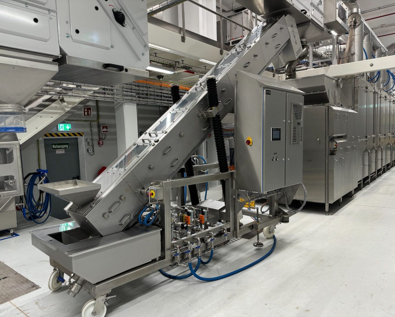 Mit unseren mobilen Besalzungsanlagen können Nüsse, Kerne, Bohnen und ähnliches kontinuierlich und schonend besalzt oder trockenbeschichtet werden. Besalzung und Coating finden bei gleichzeitiger Vertikalförderung statt. Eine polierte Edelstahlspirale verringert die Produktanhaftung an ihrer Oberfläche. Gute Durchmischung bewirkt eine gleichmäßige Optik und eine angenehme Geschmacksverteilung auf dem Produkt. Die verfahrbare Anlage kann unabhängig von dem Röster vor oder nach der Röstung eingesetzt werden. Parameter wie Salz- und Ölmenge, Neigung der Spirale sowie Spiraldrehzahl können über eine moderne Steuerung präzise eingestellt werden.